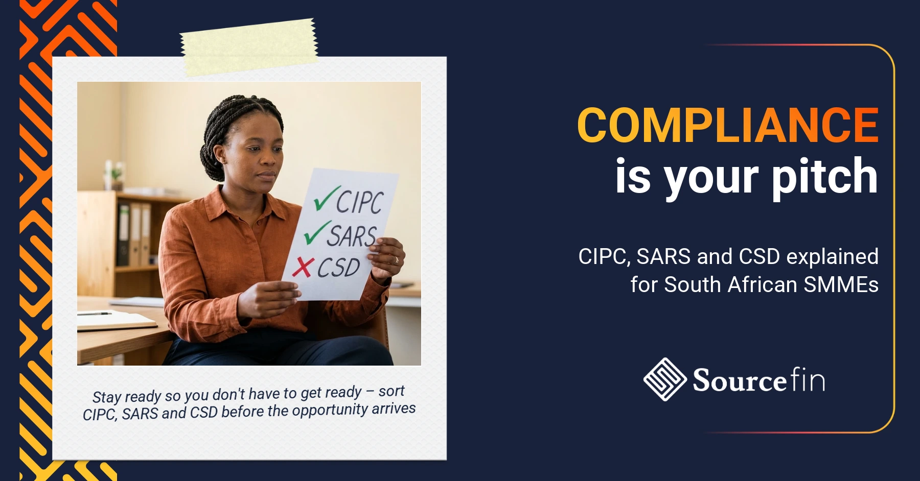 SMME compliance in South Africa means keeping your business current across three key registers: CIPC (your company registration and annual returns), SARS (your tax compliance status and returns), and the CSD (your Central Supplier Database profile). All three are checked by funders and government procurement departments before any deal proceeds.